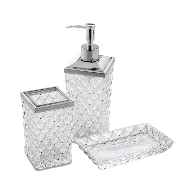 Cristallo capitone e con dettagli argentati e pompa metallo cromato. Pezzi del set: Dispenser Bicchiere Porta sapone