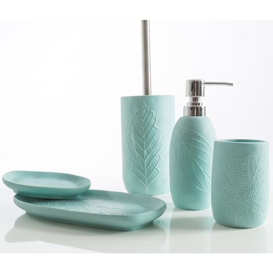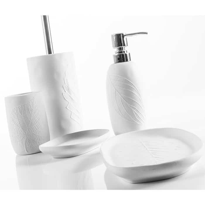 Nulla di più elegante e raffinato del disegno della Natura, delle linee di una foglia, del ricamo della linfa… Rilievi leggeri su forme morbide per una atmosfera essenziale e delicata. Colori disponibili bianco e tiffany. Pompa dosatore e manico scopino in metallo inossidabile. Pezzi del set: Dispenser Bicchiere Porta sapone Scopino Vassoio