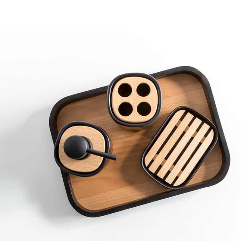 Ceramica bianco opaco con linee pure. Vassoio e porta sapone in legno richiamano i dettagli di legno del resto del set. Il manico del porta scopino e il beccuccio del dispenser sono in ABS cromato. Pezzi del set: Dispenser Bicchiere Portasapone Scopino Vassoio