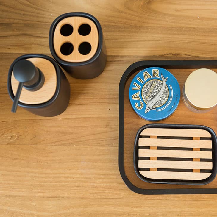 Ceramica bianco opaco con linee pure. Vassoio e porta sapone in legno richiamano i dettagli di legno del resto del set.
