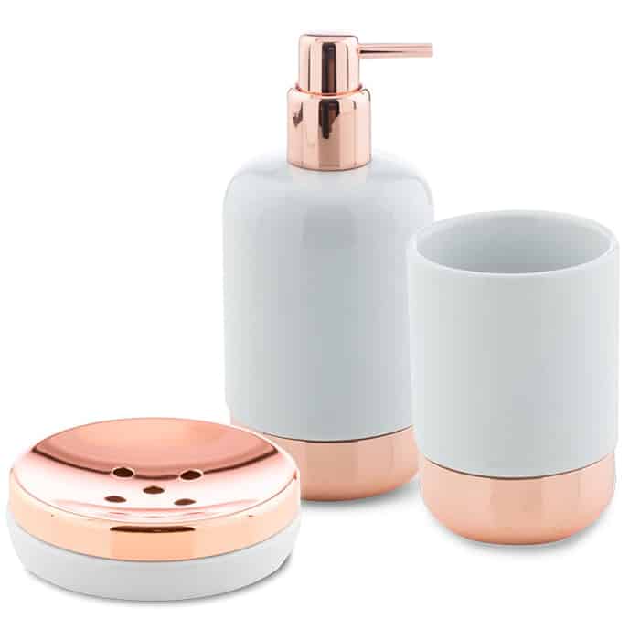 La collezione di accessori Cipì SPA è costruita in porcellana bianca con fondo in rame lucido.