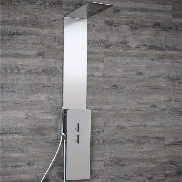 La snellezza di tutto l’insieme conferisce alla doccia un aspetto moderno, giovane e raffinato, non disgiunto dalla funzionalità dei suoi componenti, quali la rubinetteria termostatica a minima sporgenza, la doccetta manuale ed il soffione zenitale con testina anticalcare.