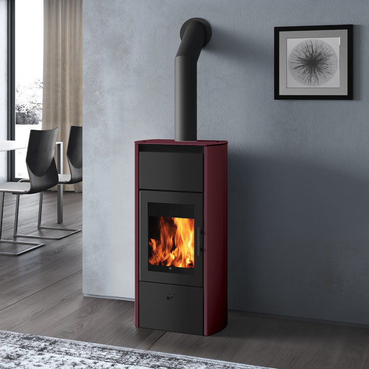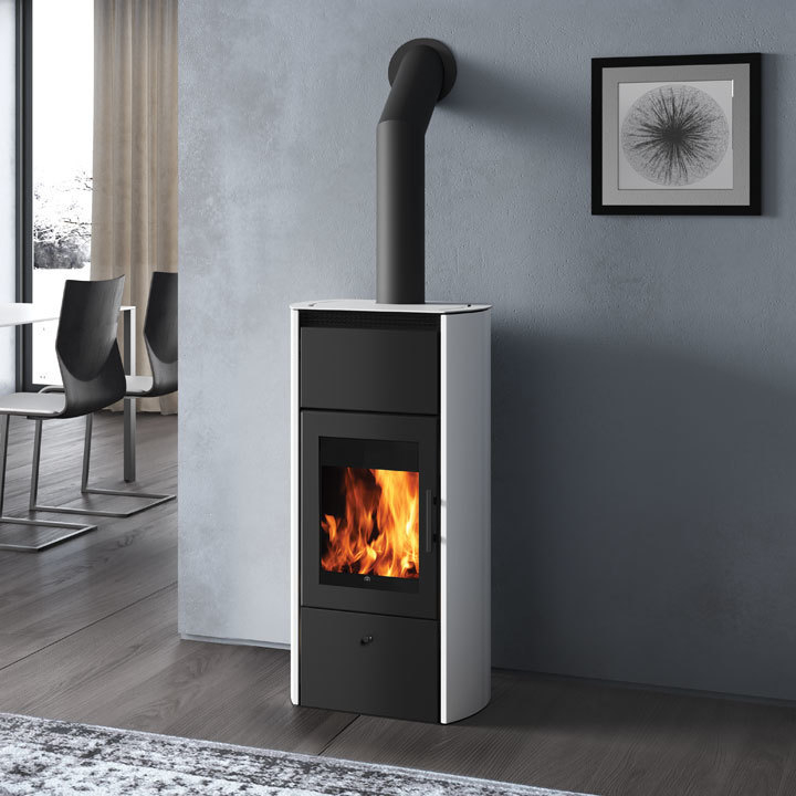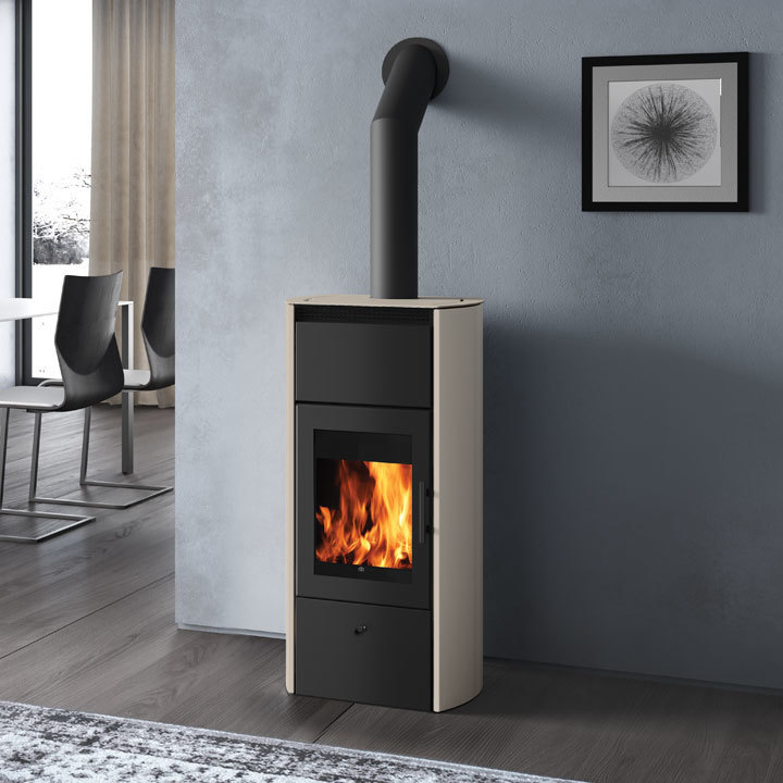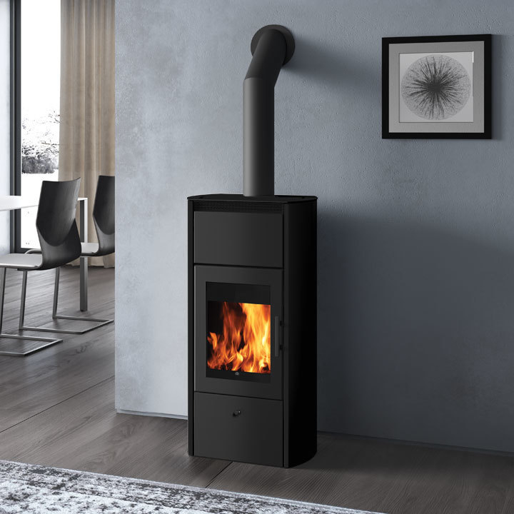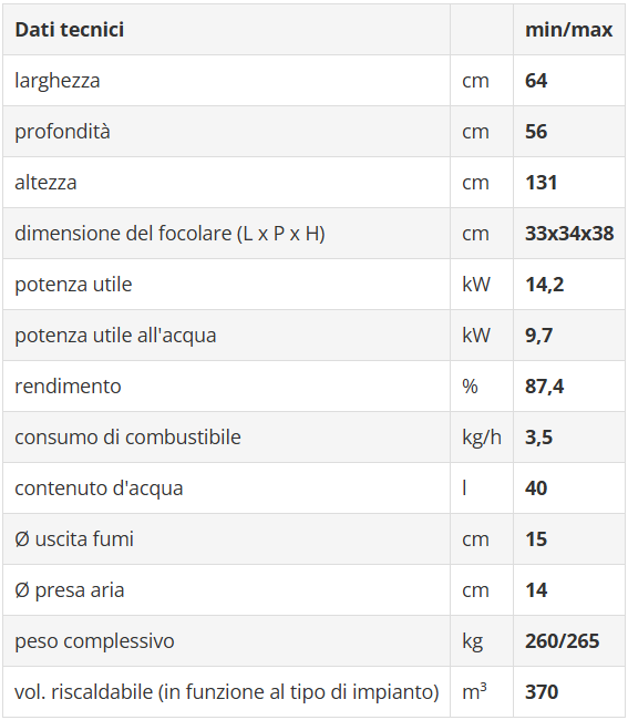 Termostufa a legna caratterizzata da un grande vetro che offre una vista ampia suggestiva della fiamma. È in grado di riscaldare termosifoni e pannelli radianti a pavimento, ed è compatibile con pannelli solari e/o caldaie a gas.