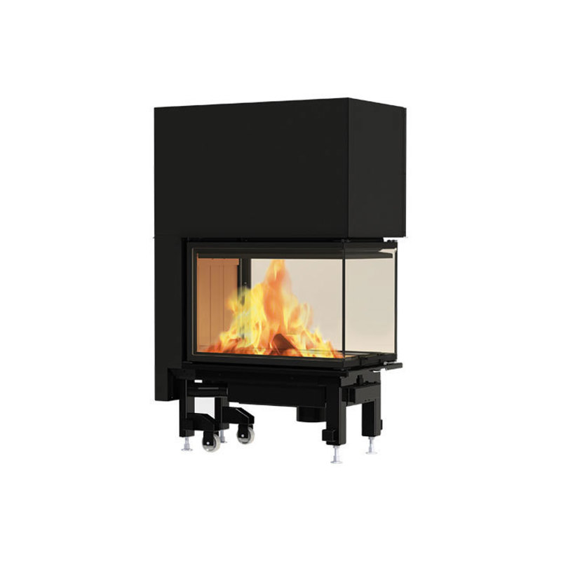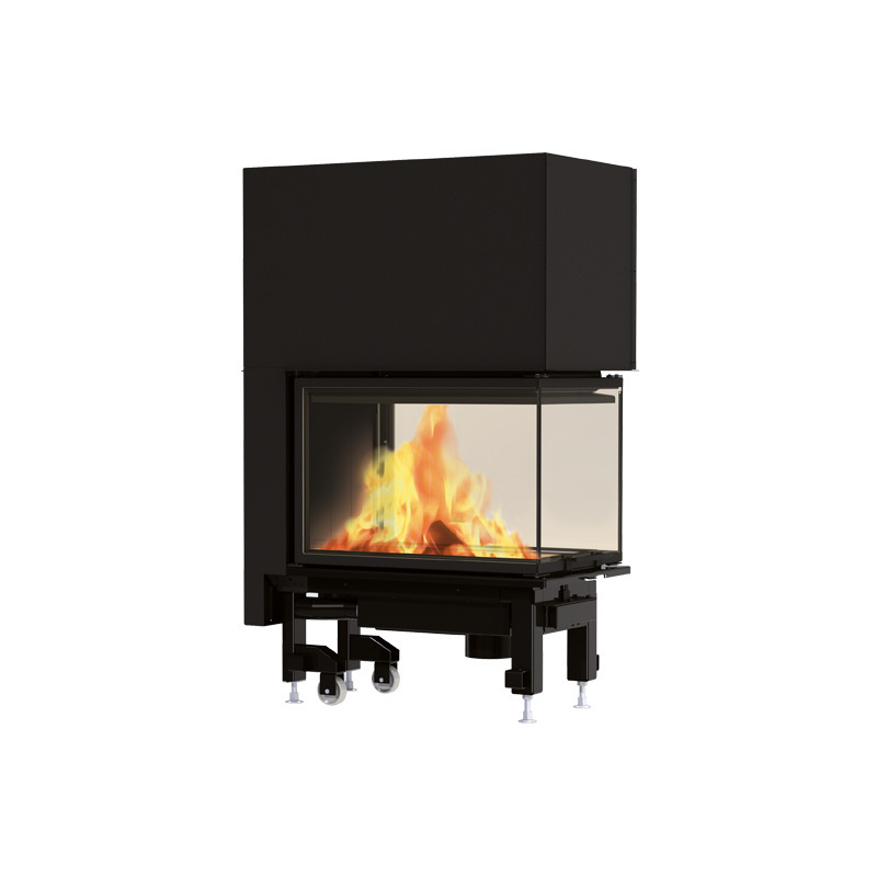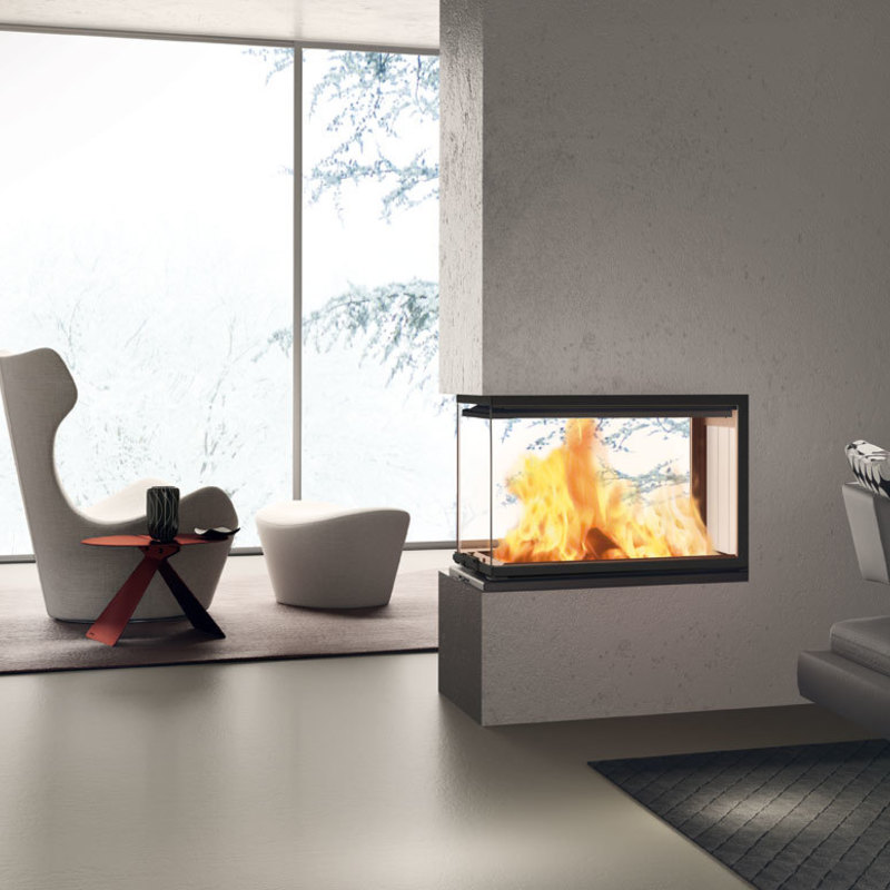 Focolare a legna trifacciale che permette l'installazione di un kit opzionale per la canalizzazione dell'aria. Il suo caratteristico vetro su tre lati offre una visione panoramica del fuoco, dando un tocco di eleganza all'ambiente circostante.